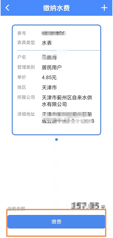 進入繳納水費界面,如果綁定了多塊水表,左右滑動選擇要繳納水費的表具后點擊繳費按鈕。如圖