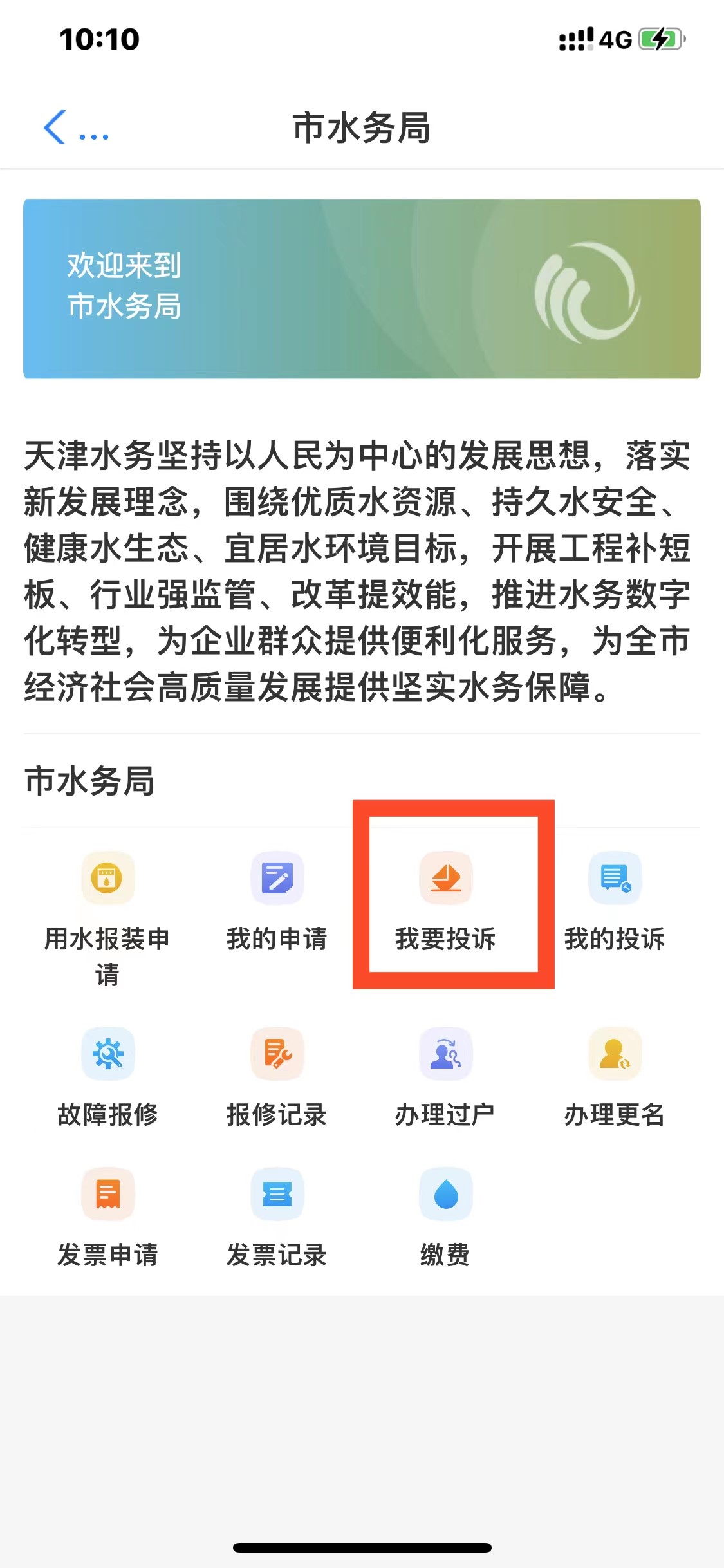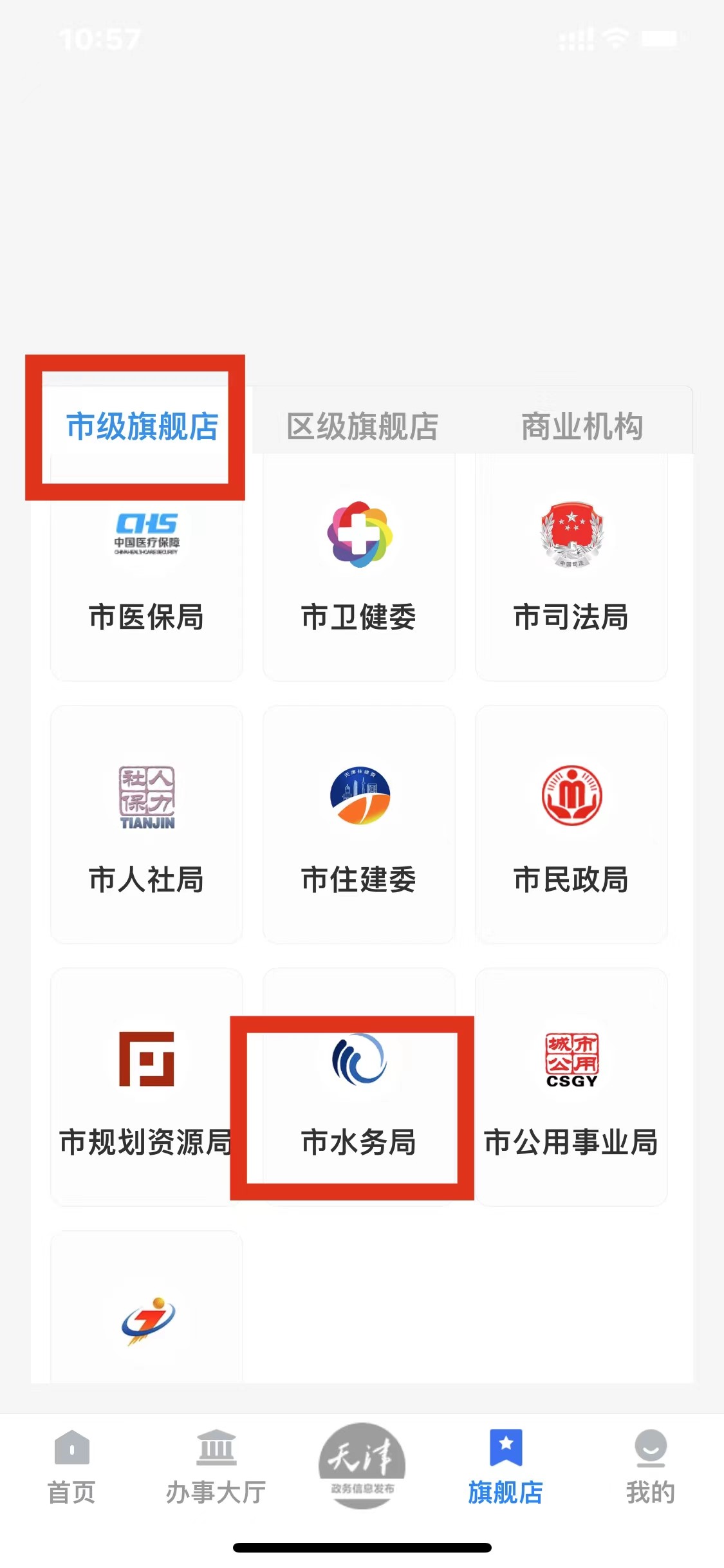 • 首頁菜單底部,選擇旗艦店->市級旗艦店->市水務(wù)局->我要投訴