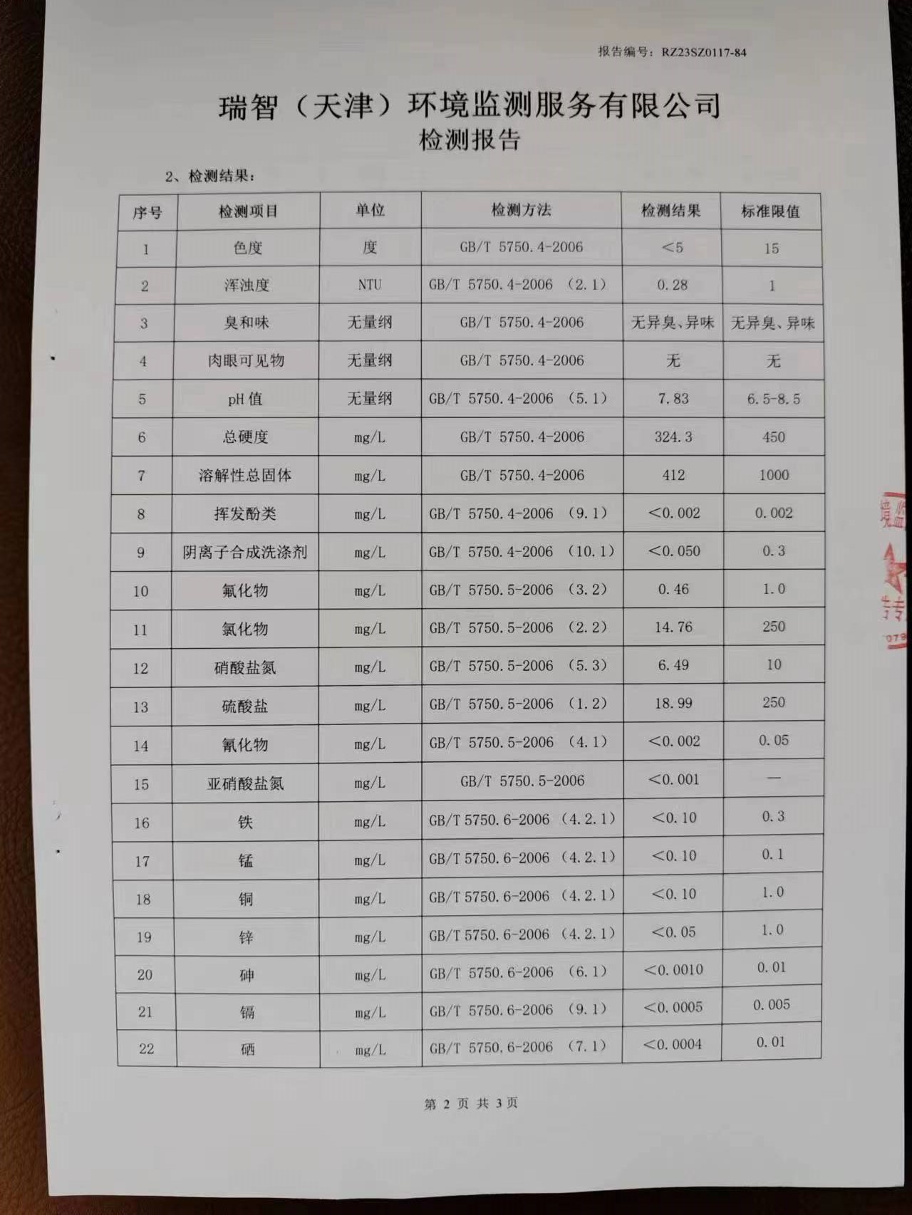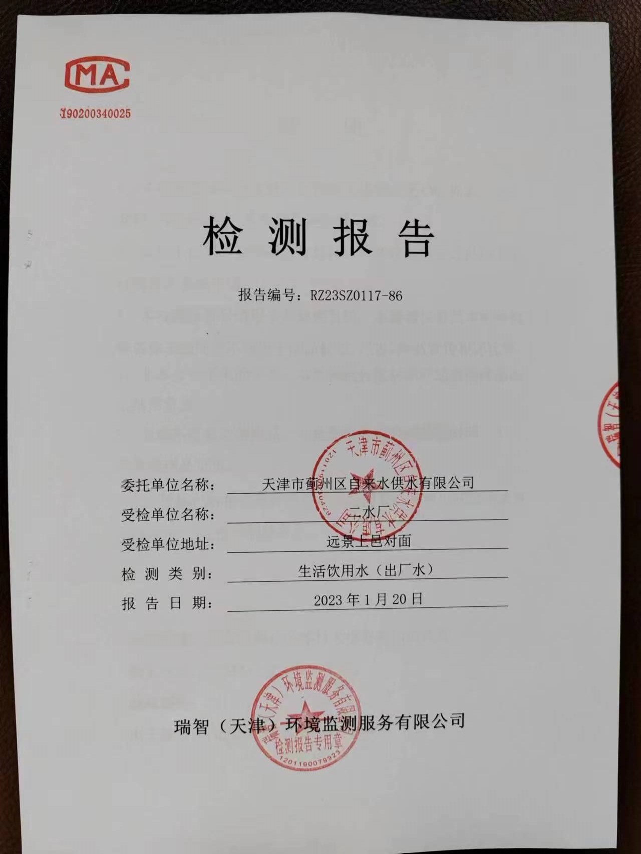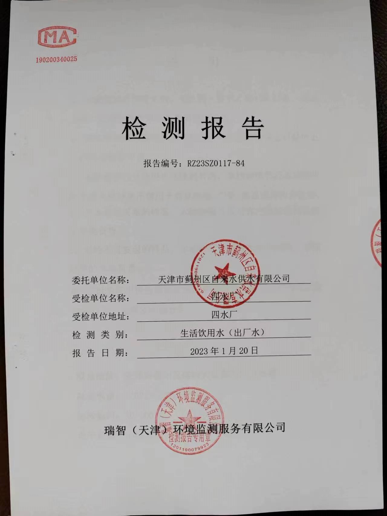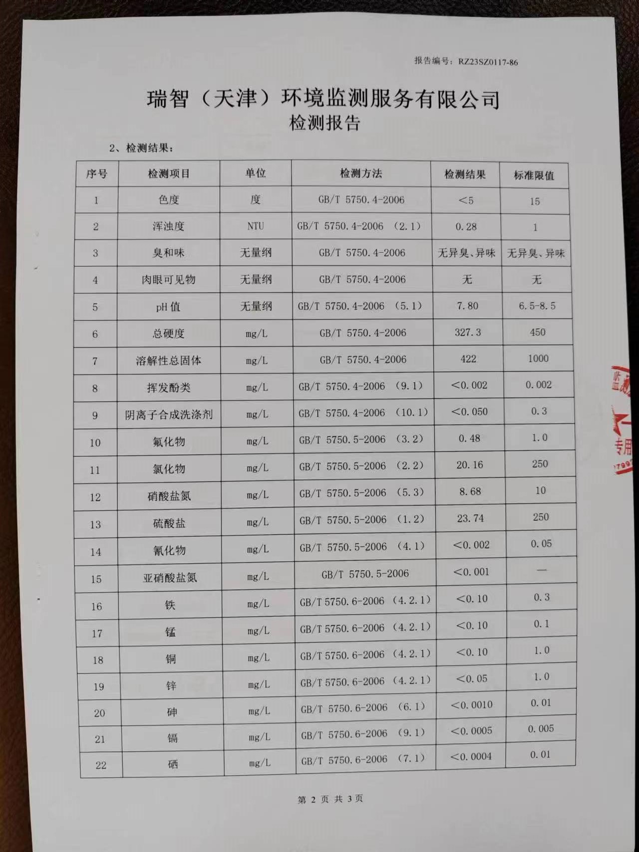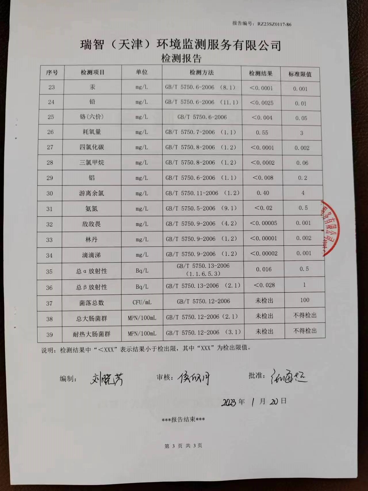 2023年1月份水質(zhì)檢測報告