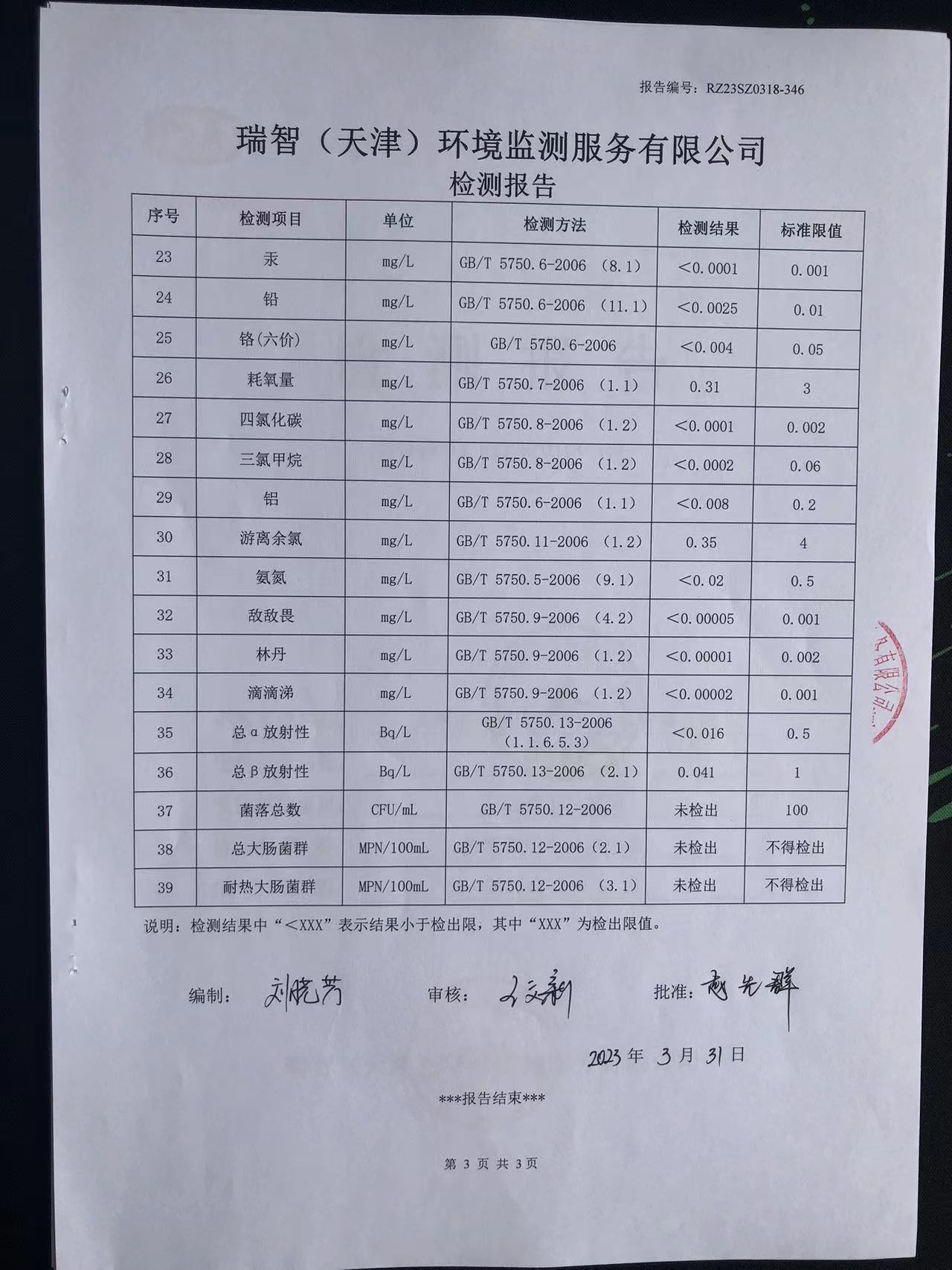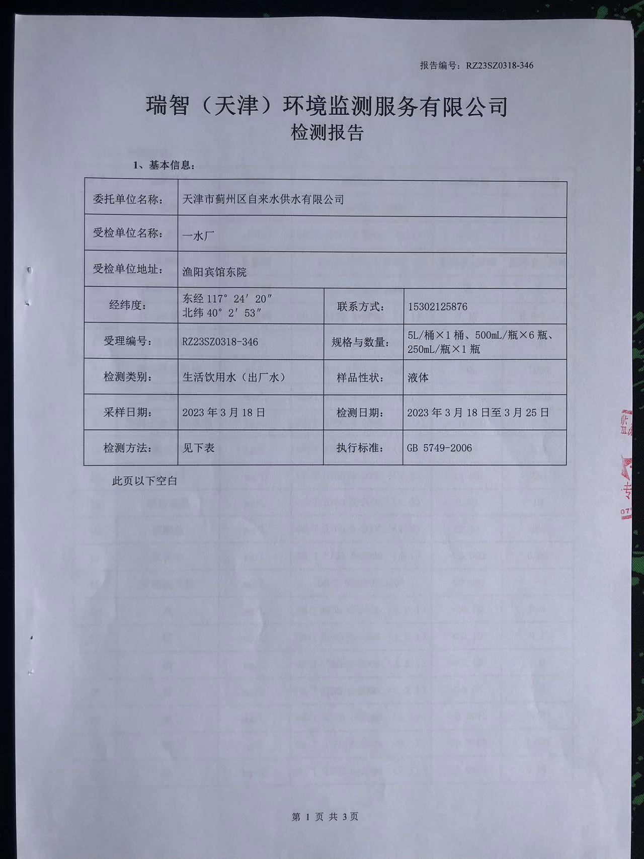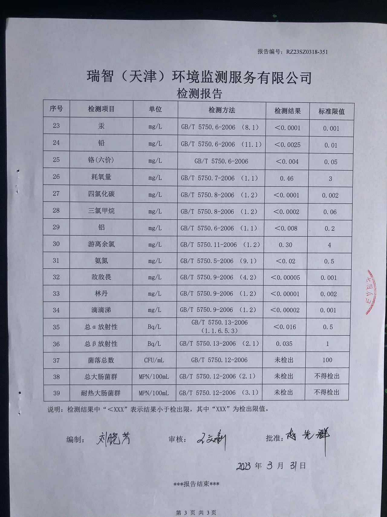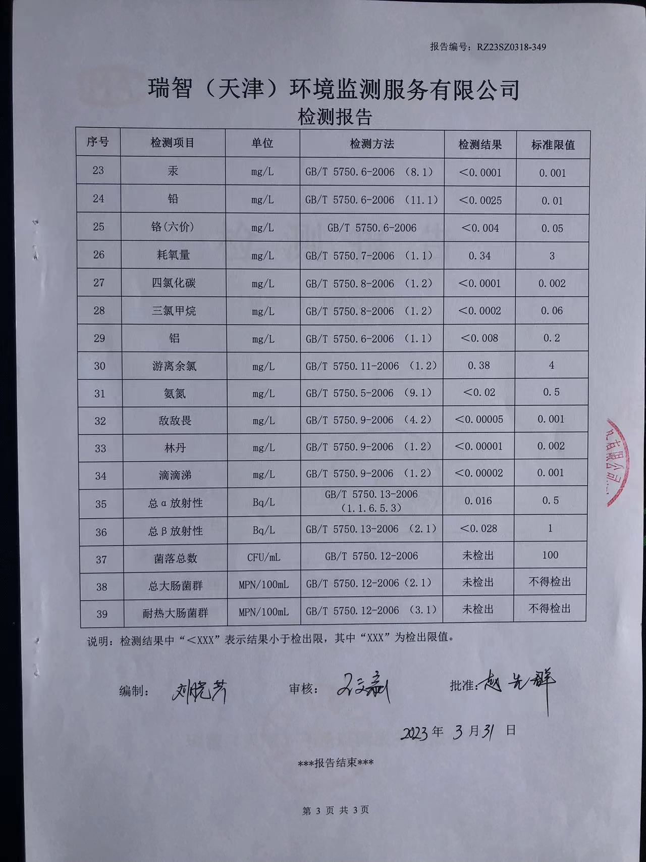 2023年3月份水質(zhì)檢測報告