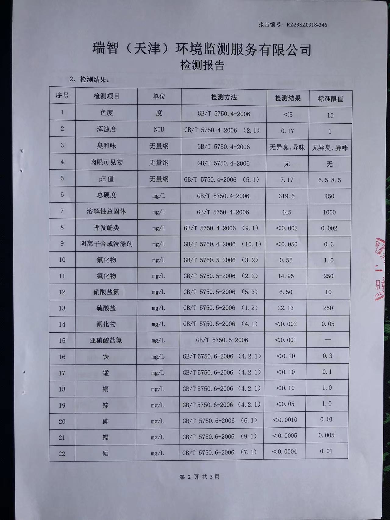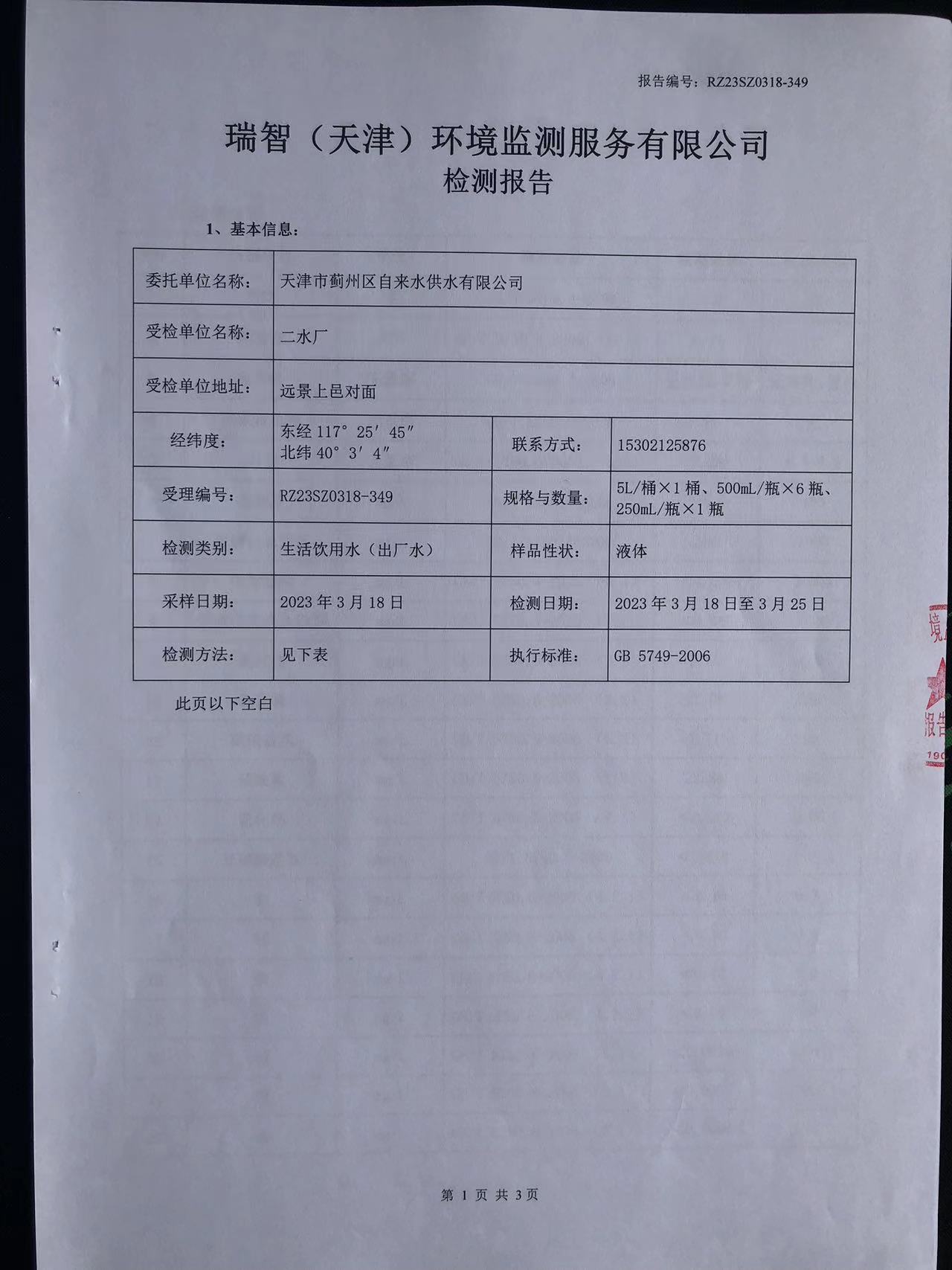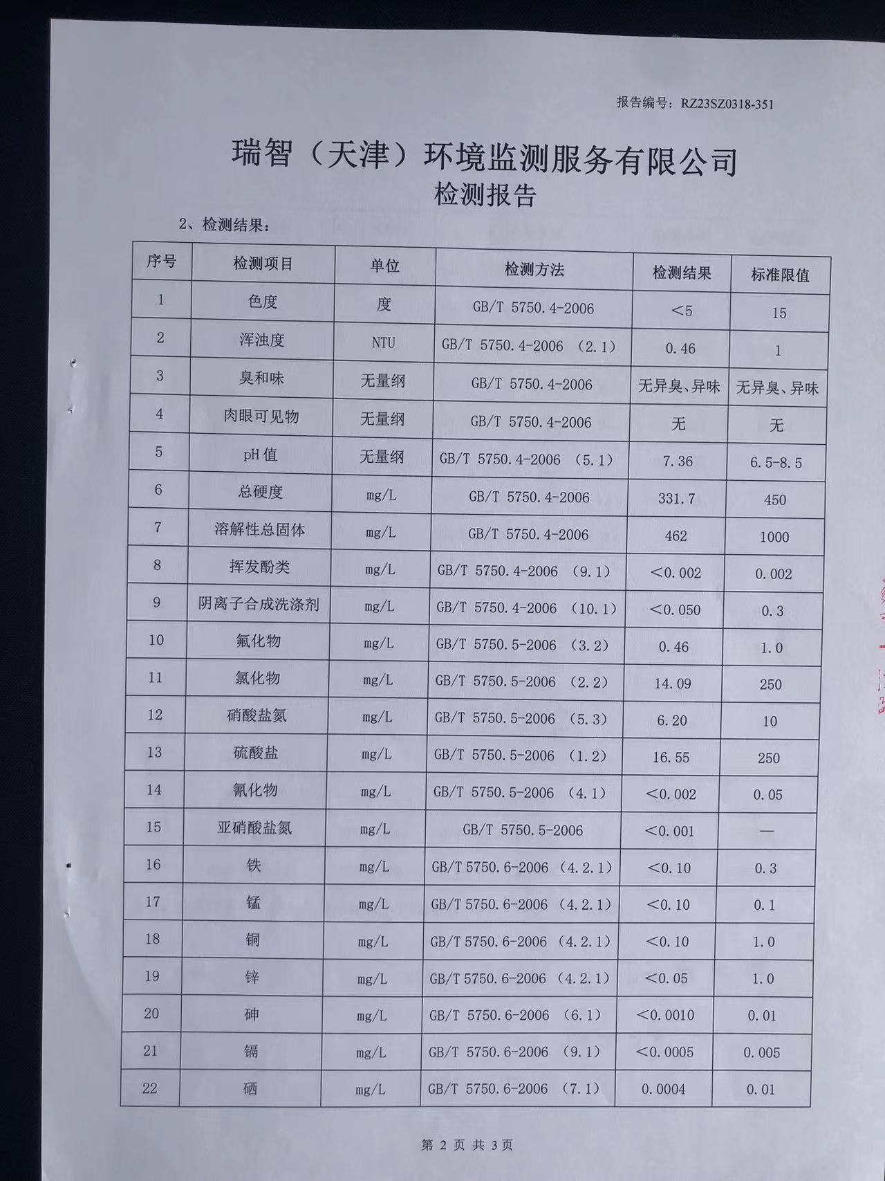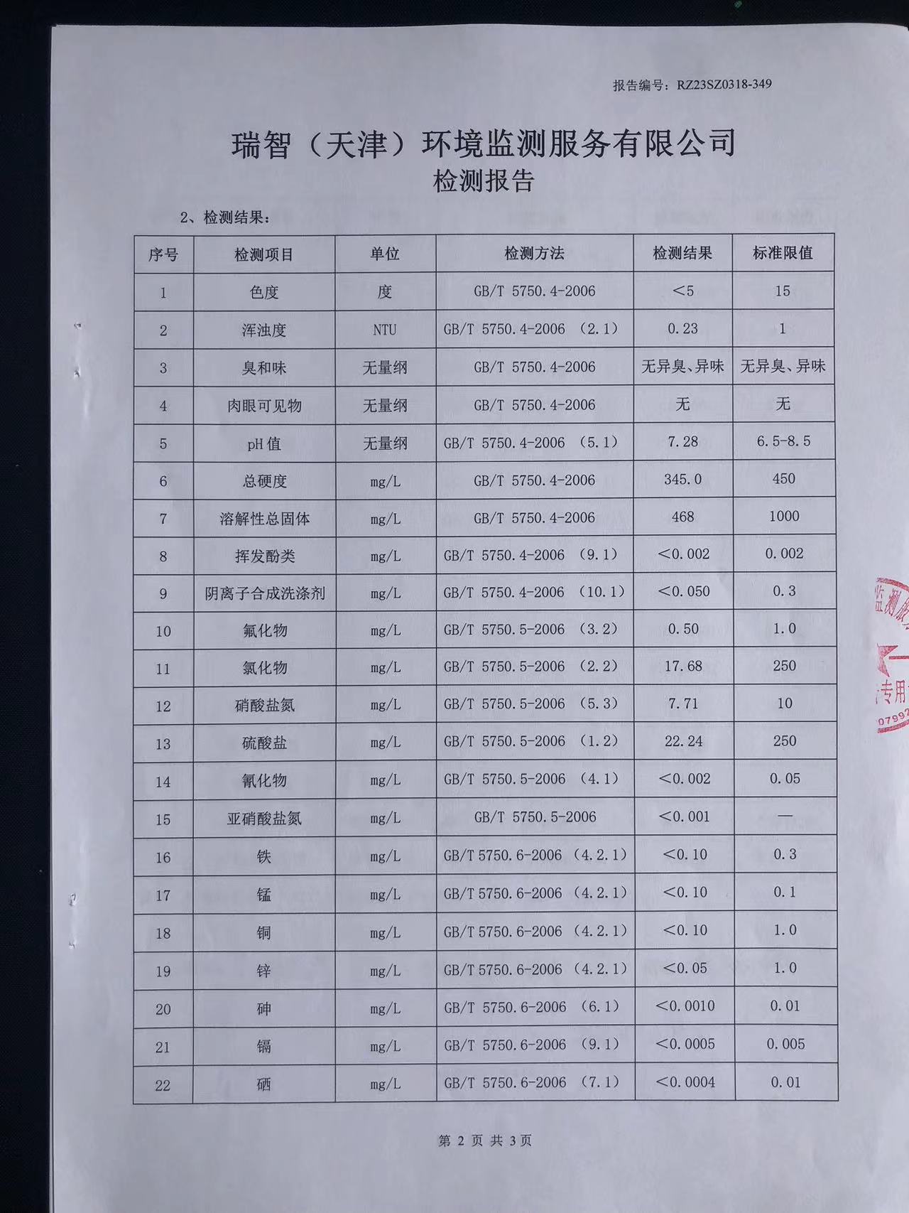 2023年3月份水質(zhì)檢測報告