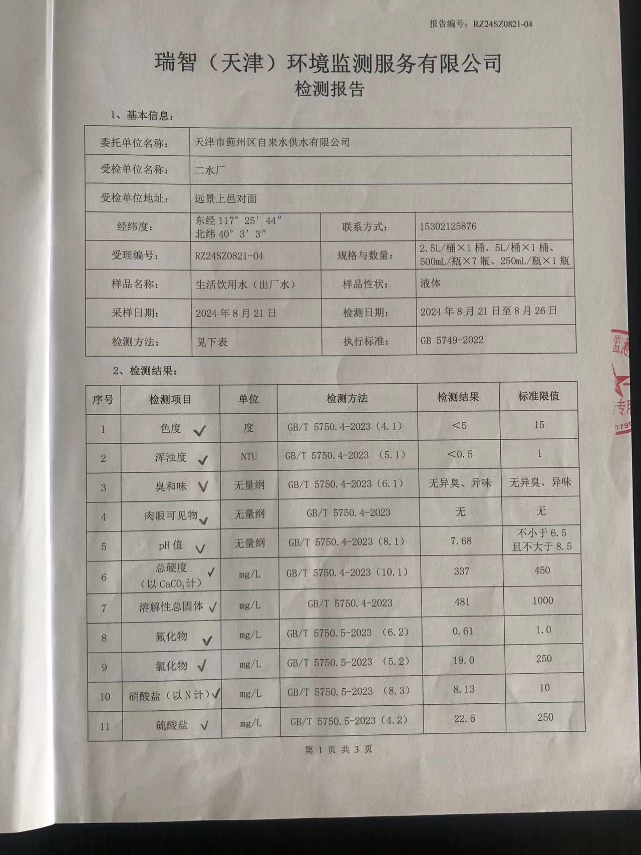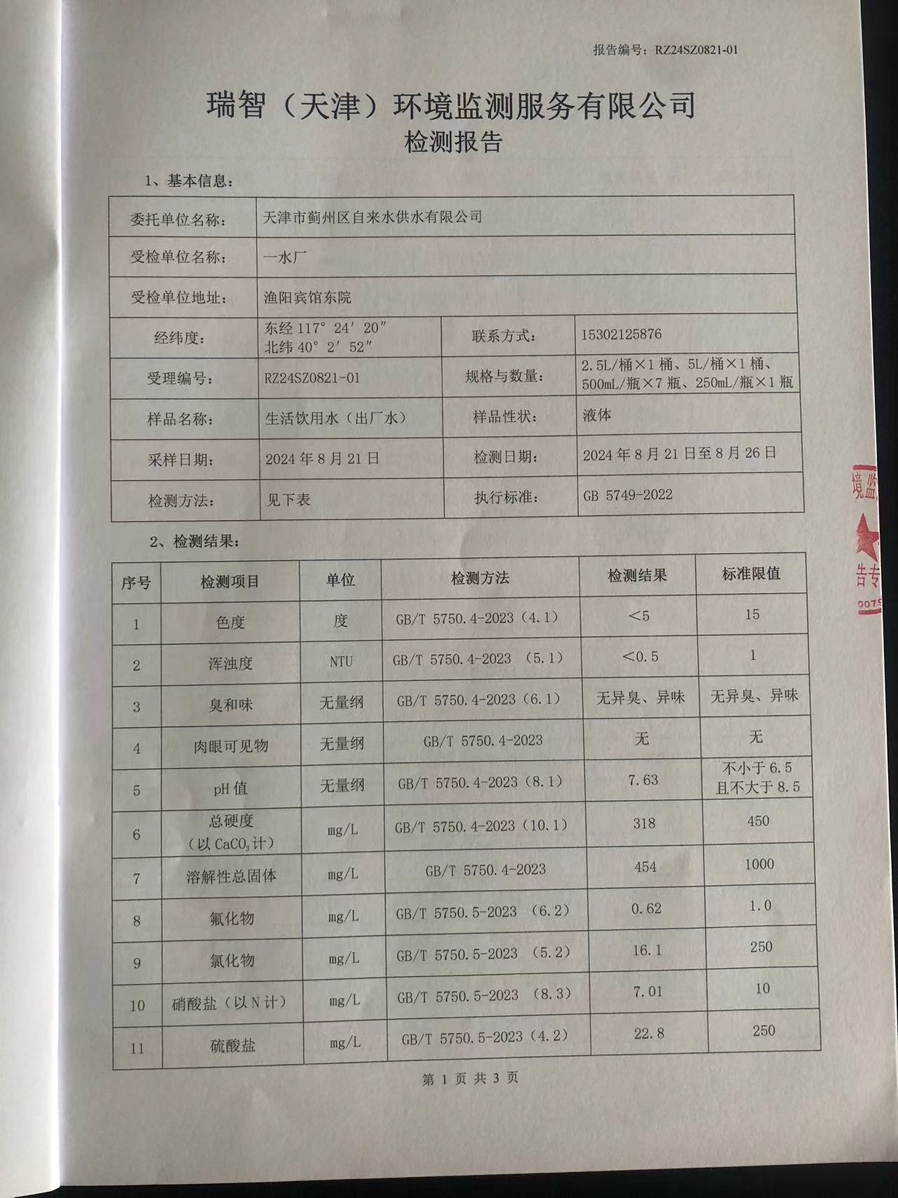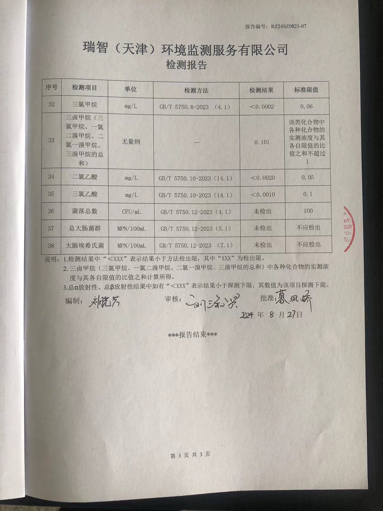 2024年8月份水質(zhì)檢測報(bào)告